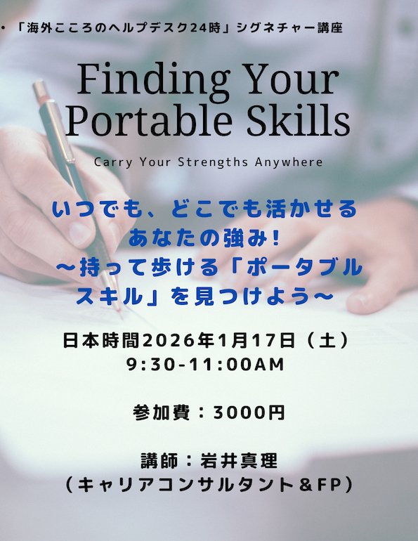開催日:日本時間 日本時間2026年1月17日(土)9:30-11:00am 申し込み受付中! 参加費:3000円(Paypalまたは銀行振込をお選びいただけます) 講師:岩井真理(キャリアコンサルタント&FP)